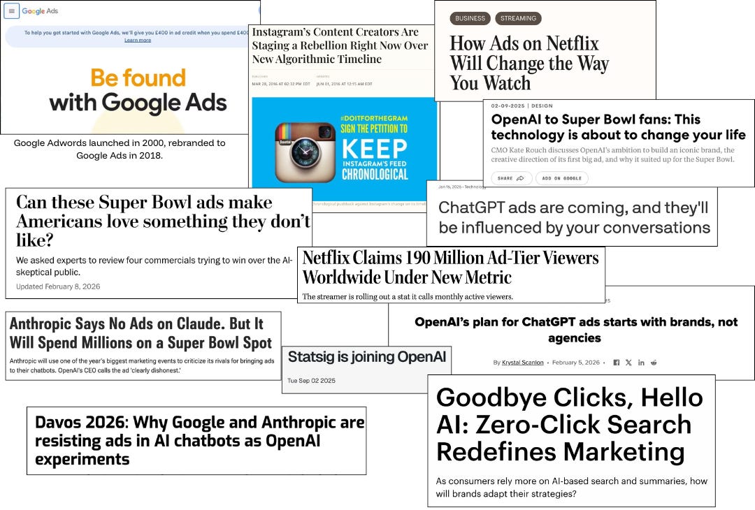 Next issue: Eight days before the ad announcement, OpenAI launched ChatGPT Health and asked users to connect their medical records. Same month. Same executive introducing both. In Part 2, I’m pulling on what happens when the platform monetizing your intent is also the one reading your lab results , while telling advertisers that ads won’t appear near health topics. And Anthropic, the company that just spent millions arguing ads don’t belong in AI, launched Claude for Healthcare the same month too. The question of who you trust with your thinking gets a lot sharper when your thinking includes your health data.